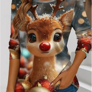 Christmas Women’s T Shirt Claus Vintage Stylish Classic Long Sleeve Crew Neck Round Neck Regular Tops Weekend Print Sage Green Army Green Royal Blue Blue Gold Winter #15888808