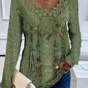 Women’s Lace Splicing Top Floral Vintage Basic Casual Long Sleeve V Neck Regular Tops Daily Lace Patchwork Print Green Spring Prefall #13494880