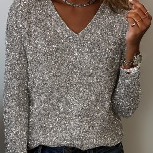 Christmas Women’s Blouse Solid Color Elegant Stylish Basic Long Sleeve V Neck Regular Tops Daily Sequins Silver Black Red Green Spring Fall Winter #16291610