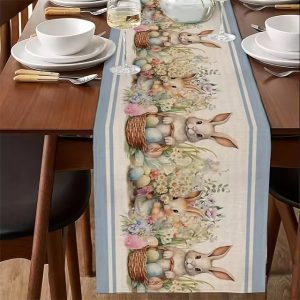 33cmx180cm Easter Bunny Linen Table Runner – Rectangular with Colorful Eggs & Watercolor Flowers Design, Ideal for Easter Decor #15410027