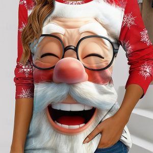 Christmas Women’s T Shirt Claus Casual Long Sleeve Crew Neck Regular Tops Weekend Print Black White Red Blue Orange Winter #11002148