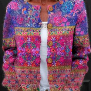 Women’s Cardigan Sweater Knitted Ribbed Button Front Round Neck Long Sleeve Lightweight Daily Floral Graphic Geometric Buttons Print Regular Tops Knit Outdoor Weekend Purple Green Spring Fall #13841143
