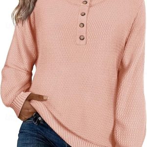 Women’s Sweater Casual Soft Pure Color Ribbed Crew Neck Buttons Knitted Long Sleeve Regular Tops Knit Outdoor Daily Weekend Black Pink Fall Winter #15972980