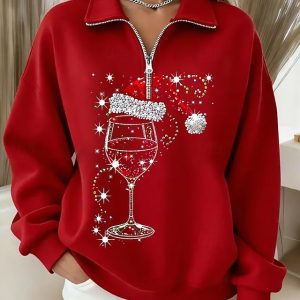 Christmas Women’s Pullover Sweatshirt Graphic Wine Glass Casual Long Sleeve Half Zip Regular Tops Dailywear Casual Black Red Gray Fall Winter #13988920