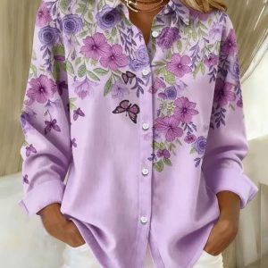 Women’s Shirt Floral Graphic Vintage Stylish Modern Long Sleeve Shirt Collar Regular Tops Daily Buttons Print White Wine Purple Fall Winter #16690265