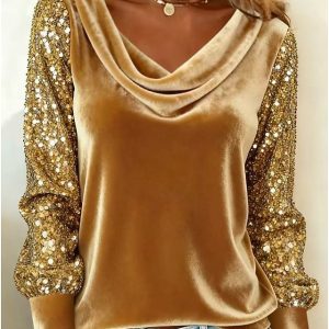 Women’s Velvet Elegant Stylish Basic Long Sleeve Cowl Neck Regular Tops Layered Blue Black Wine Gold Green Spring Fall Winter #19662005