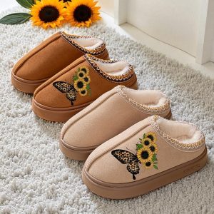 Women’s Sunflower Printed Slippers – Fleece Lined Warm Indoor Shoes with Butterfly Design, Cozy Home Footwear for Winter Gifts #13749053