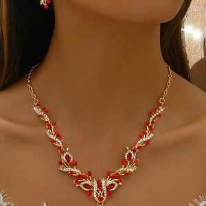 Women’s Red Crystal Jewelry Set, Elegant Rhinestone Necklace and Earring Set with Gold Detailing, Perfect for Parties, Weddings & Evening Events #11223873