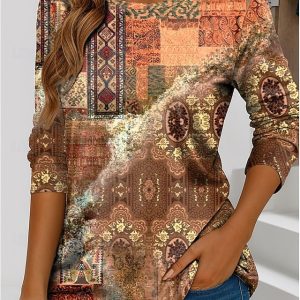 Women’s T Shirt Ombre Graphic Vintage Fashion Stylish Long Sleeve Crew Neck Regular Tops Daily Going out Weekend Pocket Print Blue Pink Green Spring Fall Winter #10271023