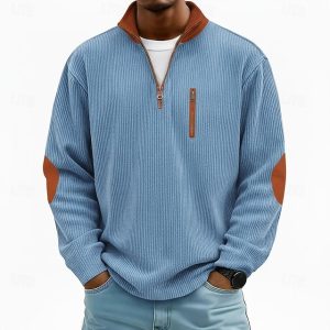 Men’s Corduroy Shirt Tee Top Long Sleeve Shirt Long Sleeve Zip Fall Winter Color Block Daily Textured Casual Zip Up Oversized Loose Casual Outdoor Street Light Blue Black Dark Blue Top Tee for Men #15782577