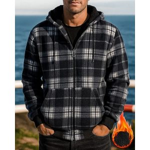 Men’s Flannel Jacquard Jacket Hoodie Shirt Jacket with Pockets Long Sleeve Top Athleisure Plaid Checkered Windproof Warm Hiking Travel Vacation Sportswear Activewear Red / black Red black Green #11305954