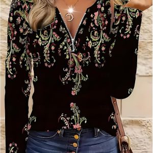 Women’s T Shirt Quarter Zip Long Sleeve Casual Graphic Tribal Vintage Bohemia Tropical Hawaiian V Neck Regular Tops Daily Going out Black Spring Fall #11539120