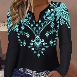Women’s T Shirt Graphic Plants Vintage Stylish Classic Long Sleeve V Neck Notched Neck Regular Tops Daily Print Black Blue Spring Fall #17359610