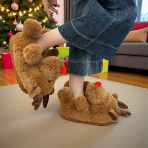 Women’s Christmas Reindeer Plush Slippers with Red Nose and Bow – Cozy Holiday Footwear for Christmas #15842355