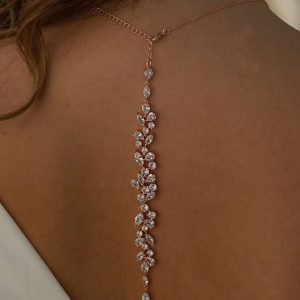 Women’s Rose Gold Crystal Back Drop Necklace – Elegant Long Chain Jewelry for Prom, Ballroom and Evening Parties #16198684