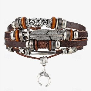 Men’s Boho Multi-Layer Leather Bracelet with Feather and Crescent Moon Charm – Vintage-Inspired Adjustable Wrap Bracelet for Casual Style #9793335