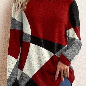 Women’s T shirt Long Sleeve Crew Neck Long Sleeve Tunic Argyle Pattern Cozy Plush Pullover Red Black Gray White Round Neck Casual Elegant Warm Autumn Winter Clothing Apparel Prefall #10846223