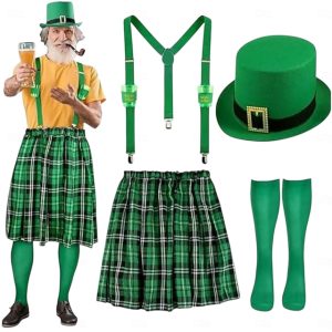 Men’s St. Patrick’s Day Green Tartan Kilt Costume Set – Includes Hat, Suspenders, Socks, and Accessories for Festive Celebrations #19304051