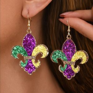 Women’s Faux Leather Three-Color Fleur-de-lis Earrings for Mardi Gras Celebration, Vibrant Purple, Green, and Yellow, Sparkling Design, Perfect for Carnival Festivities #12882062