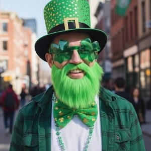 Men’s St. Patrick’s Day Costume Set – Green Leprechaun Hat, Bow Tie, Beard, Shamrock Glasses & Necklace, Perfect for Festive Holiday Celebrations #13944712