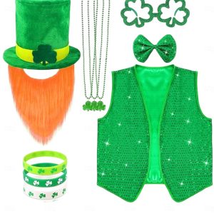 Men’s St. Patrick’s Day Green Leprechaun Hat, Beard, Vest, Necklace, Bow Tie & Bracelet Set – Complete Festive Outfit for St. Patrick’s Day Celebrations #12486063