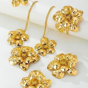 Women’s Statement Gold-Tone Flower Jewelry Set – Alloy Necklace, Earrings, Bracelet & Ring for Carnival, Mardi Gras and Costume Party #14335816