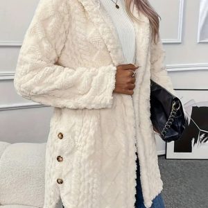 Women’s Sherpa Jacket Casual Jacket Comfortable Breathable Pocket Buttons Casual Plain Vacation Street Casual Daily Wear Open Front Regular Hooded Regular Fit Long Sleeve Outerwear Black White Apricot #19279088