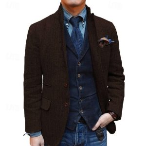 Men’s Retro Vintage Tweed Blazer Herringbone Wool Blazer Sport Coat Regular Plus Size Single Breasted Two-buttons Black Champagne Burgundy Blue #9746272