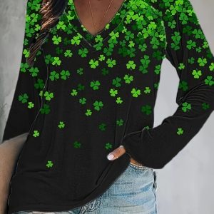St. Patrick’s Day Women’s T Shirt V Neck Long Sleeve Graphic Casual Vacation Daily Green Spring & Fall #18230481