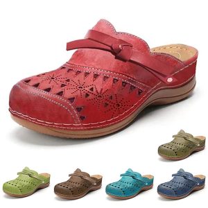 Women’s Red Faux Leather Clogs – Vintage Style Slip-On Shoes with Laser-Cut Floral Design and Comfortable Cushioned Sole for Casual Everyday Wear #9451882
