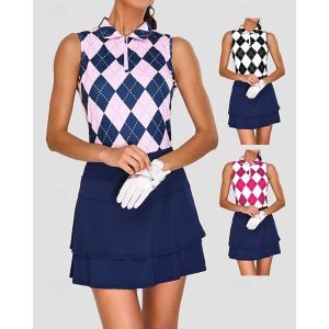Women’s Plaid / Check Sport Shirt Golf Polo Shirt Tennis Shirt Sleeveless Zipper High Elasticity Moisture Wicking Breathable Tennis Golf Pickleball Turndown Zip Collar Shirt Top Dark Pink Black Pink #12358745