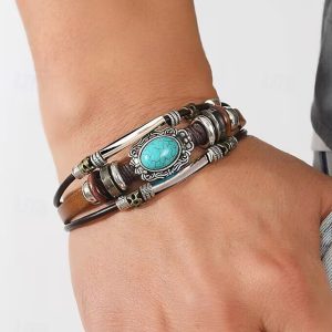 Men’s Turquoise Leather Cuff Bracelet with Skull and Metal Accents, Bohemian Western Style, Perfect for Casual and Everyday Wear #15680384