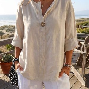 Women’s Linen Shirts Blouse Patchwork Plain Stylish Modern Casual Long Sleeve V Neck Regular Tops Daily Holiday Going out Black White Navy Blue Orange Green Summer Spring #18229134