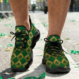 Men’s St. Patrick’s Day Shamrock Print Sneakers – Lightweight Athletic Shoes with Air Cushion Platform Sole, Green & Gold Design, Ideal for Casual Wear & Parades #15658236