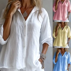 Women’s Shirt Solid Color Plain Stylish Casual Long Sleeve Shirt Collar Regular Tops Daily Holiday Buttons Blue White Yellow Pink Summer Spring #17457840