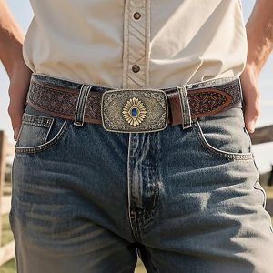 Men’s Western Tooled Faux Leather Belt with Vintage Engraved Buckle and Blue Gem, Cowboy Style for Rodeo, Outdoor Events and Casual Wear #15257075
