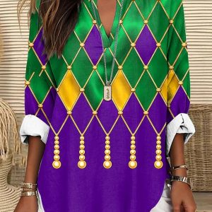 Mardi Gras Women’s Blouse Linen Like Breathable Lightweight Graphic Vintage Daily Stylish Long Sleeve V Neck Long Tops Daily Holiday Print White Light Purple Purple Summer Spring #17813905