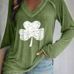 St. Patrick’s Day Women’s T Shirt V Neck Long Sleeve Graphic Casual Shamrock Fashion Regular Tops St.Patrick’s Day Print Grass Green White Light Green Dark Green Green Spring & Fall #10102910