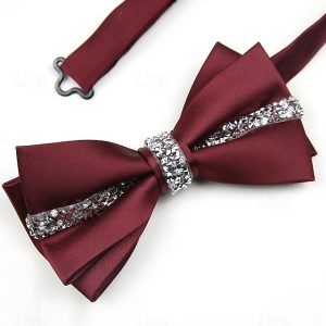 Men’s Burgundy Satin Bow Tie with Crystal Accent, Luxury Formal Style, for Grooms and Elegant Wedding Ceremonies #10741493