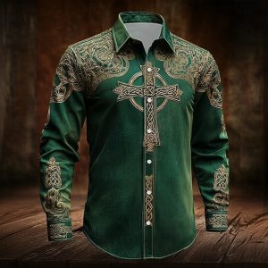 St. Patrick’s Day Men’s Celtic Cross Intricate Floral Shirt Button Up Shirt Long Sleeve Vintage Retro Holiday Spring Fall Turndown 3D Print Linen Like Shirt Light Green Green #15822182