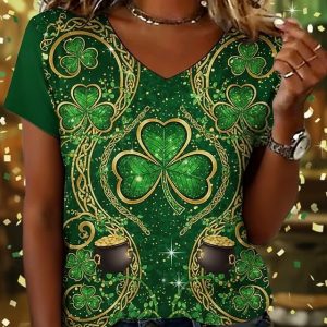 St. Patrick’s Day Women’s T Shirt Print Graphic Shamrock Vintage Stylish Classic Short Sleeve V Neck Regular Tops Daily Weekend Vacation Wear Green Summer Spring #18288371