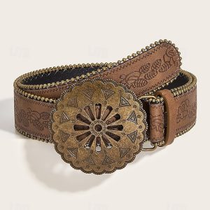 Women’s Boho Floral Engraved Wide Leather Belt – Vintage Western Style with Antique Gold Flower Buckle, Adjustable Waistband for Dresses, Festivals and Daily Wear #10319112