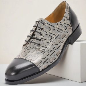 Men’s Premium Leather Wedding Shoes – Grey Patterned Design with Black Leather Cap, Stylish Formal Footwear for Weddings and Special Occasions #11970363