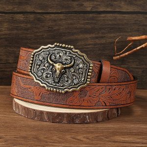 Men’s Western Faux Leather Belt with Embossed Floral Design and Bull Head Buckle – Vintage Cowboy Style #13515782