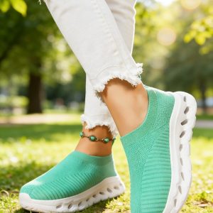 Women’s Green Breathable Flyknit Slip-On Shoes – Modern Lightweight Athletic Sneakers with Hollow Sole for Walking, Gym and Everyday Wear #17440473