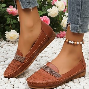 Women’s Camel Casual Slip-On Loafers – Faux Leather Flats with Rhinestone Strap, Perfect for Comfortable Everyday Wear, Walking, Office, Driving and Casual Outfits #18511025