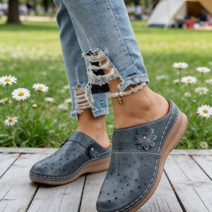 Women’s Blue Perforated Mule Clogs – Floral Detail Comfort Casual Shoes, Ideal for Garden Walks, Picnics, Daily Errands & Outdoor Gatherings #16946539
