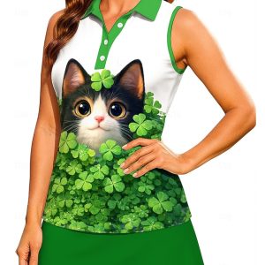 St. Patrick Women’s Cat Plants Clover Workout Tank Top Shirt Sport Shirt Golf Polo Shirt Sleeveless Sporty UPF50+ UV Resistant Trainer Dancing Breathable Tennis Badminton Pickleball Fold-over Collar #15498640