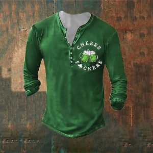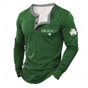 Men’s St. Patrick Graphic Lucky Clover Henley Shirt Long Sleeve Fashion Cute Daily Casual Holiday Going out Spring & Fall Black Green Henley Henley T-Shirt #17472709