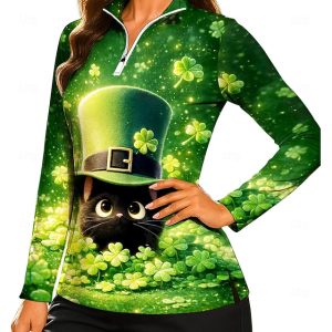 St. Patrick Aus Open Women’s Cat Clover Sweatshirt Polo Sweatshirt Tops Shirt Long Sleeve Print Quarter Zip Pullover UPF50+ UV Resistant UV Protection Elastic Breathable Volleyball Tennis Golf High #14588118